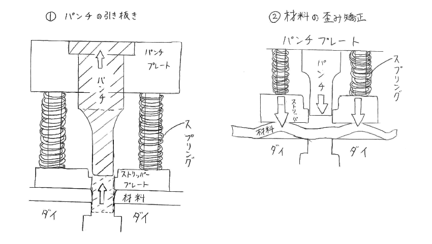 ストリッパープレートとは、材料を打ち抜きした際、材料に突き刺さったパンチから材料を引き剥がす(ストリップする)プレートを指します。
